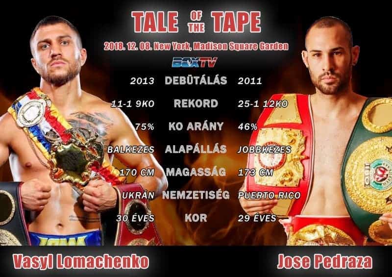 Egy hosszabb kihagyás után ismét szorítóba lép az ukrán fenomén Vasyl Lomachenko (11-1; 9 KO). Ellenfele a WBO könnyűsúlyú világbajnok Jose Pedraza (25-1; 12 KO) lesz. Lomachenko idén májusban szerezte meg a WBA (Super) könnyűsúlyú világbajnoki címét Jorge Linares legyőzésével, azóta pedig sérülés miatt nem tudott szorítóba lépni. Az eredeti tervek szerint már augusztusban megküzdött volna a WBO övért, ami akkor még Raymundo Beltran birtokában volt. Vállsérülése miatt azonban műteni kellett Loma-t, így Pedraza kapta meg a lehetőséget, hogy megszerezze a WBO övet és élt is vele, így az ukránnak már vele kell küzdenie. A most szombati mérkőzés lesz mindkét bunyós számára az első címvédése mióta megszerezték könnyűsúlyú világbajnoki öveiket és egyikük máris két nagy szervezet világbajnoka lehet.